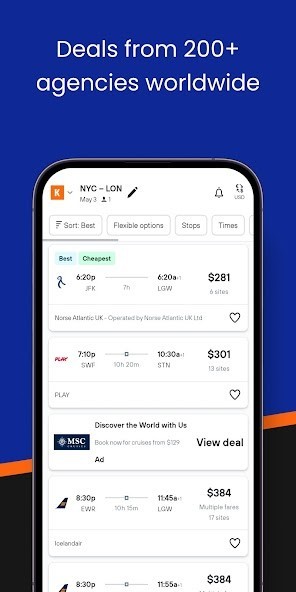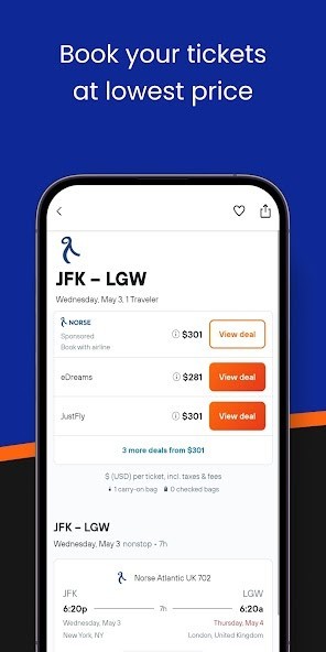 Our flight booking app helps you search, compare prices and book cheap airline tickets from hundreds of flight booking agencies and websites. We have flight tickets for cheap flights booking, last minute flights booking, domestic, and international air tickets, cheap airlines tickets booking, etc. Compare deals from Kayak, Cheapoair, Skyscanner, Hopper, Skiplagged, Justfly, Kiwi, Travelzoo, Aviasales, Scotts cheap flights, Wayaway, Edreams, Momondo, etc. Get exclusive last minute flights deals with us and save your time and money!Find unbeatable flight booking deals on airplane tickets from major airlines like American airlines, Southwest airlines, United airlines, American eagle, Spirit airline, Jetblue, Delta, Frontier airlines, Alaska airlines, Allegiant air, British airways, Jetcost, ITA Airways, Hawaiian airlines, Ryanair, Qatar airways, Fly Frontier, Egyptair, Kuwait airways, and many more cheap flights.