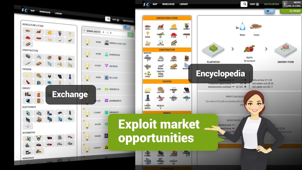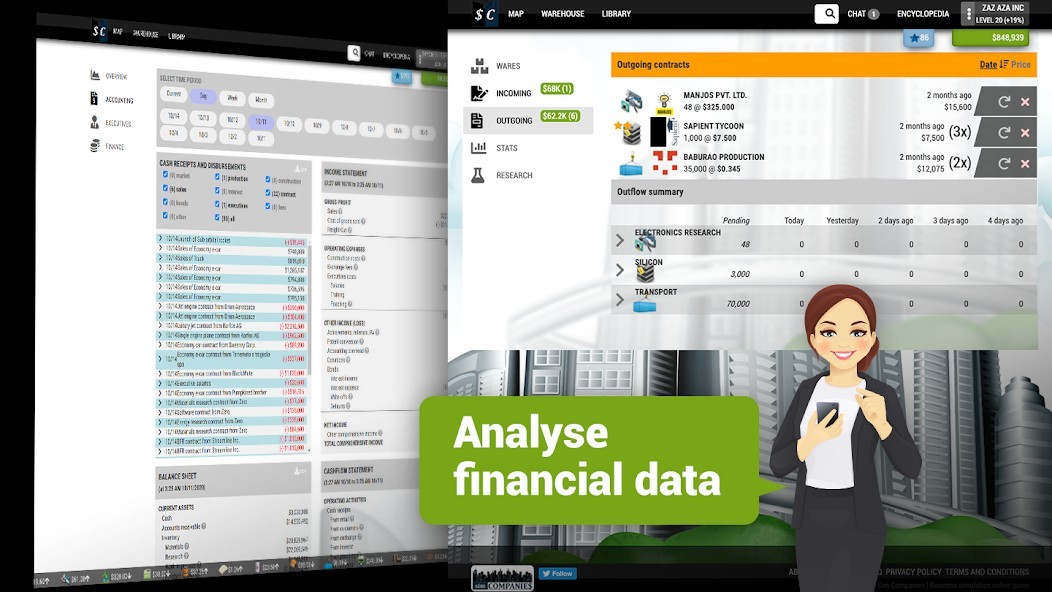 Sim Companies is a business simulation strategy game aimed at giving you the fun and experience of managing a company using real-world economic principles.The goal of the game is to create a profitable and competitive business. Each player receives a starting capital and few assets. Players' day-2-day tasks consist of managing the resource supply chain, from production to selling in retail, procuring business partners, ensuring financing, etc. For players to do really well, they would have to be able to read market conditions and take some trading shortcuts here and there, maybe buy their input resources on market cheaper than if they produced them or sell them on the market with a higher profit than in the retail.